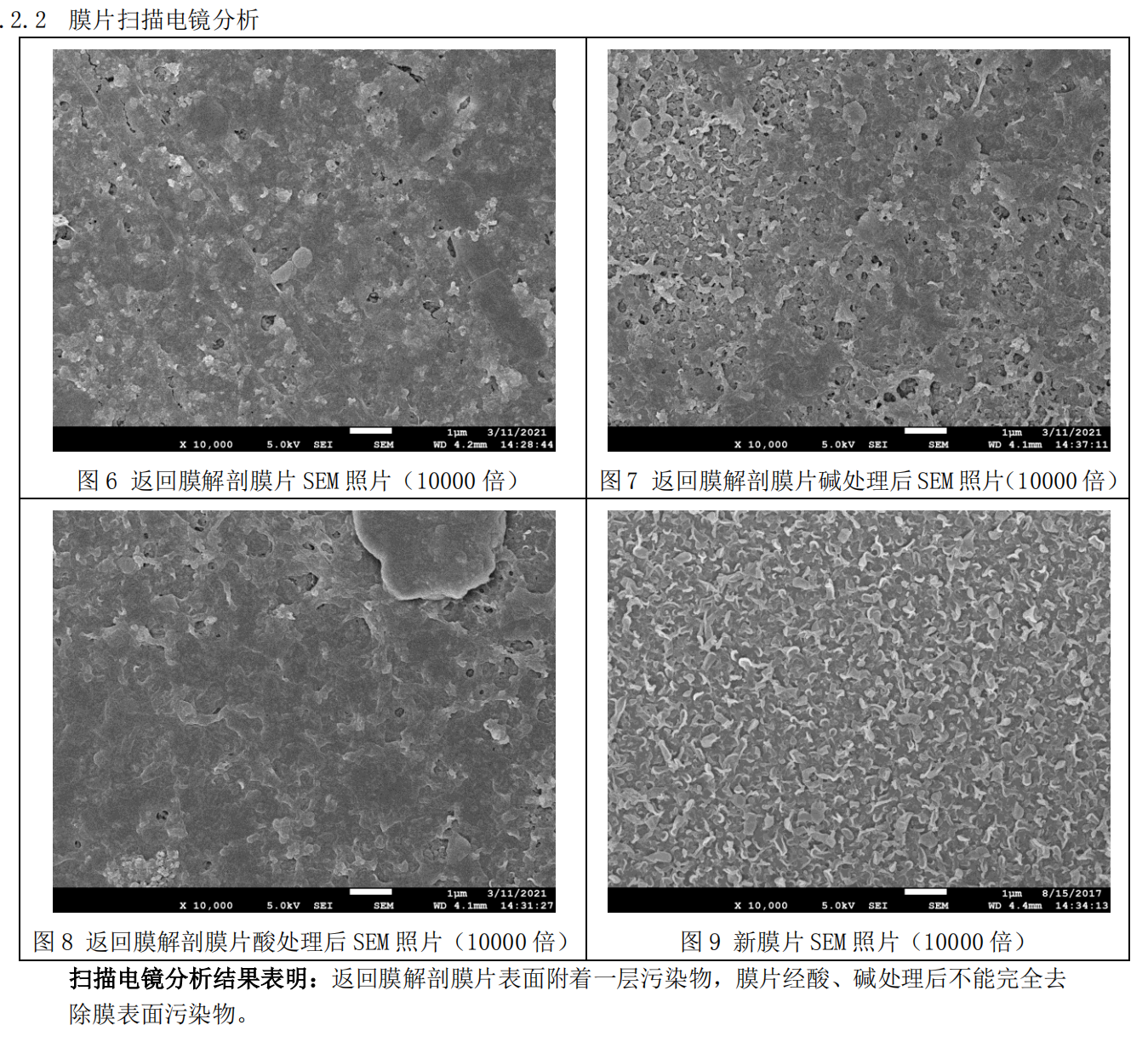 4.1進行離線清洗(堿洗、酸洗,并使用多種螯合配方),膜通量有一定恢復(fù)但難以有效恢復(fù)。污堵嚴重膜元件進行返廠處理,下附返廠膜元件廠家膜片掃描電鏡照片及返廠膜元件清洗情況及結(jié)論: